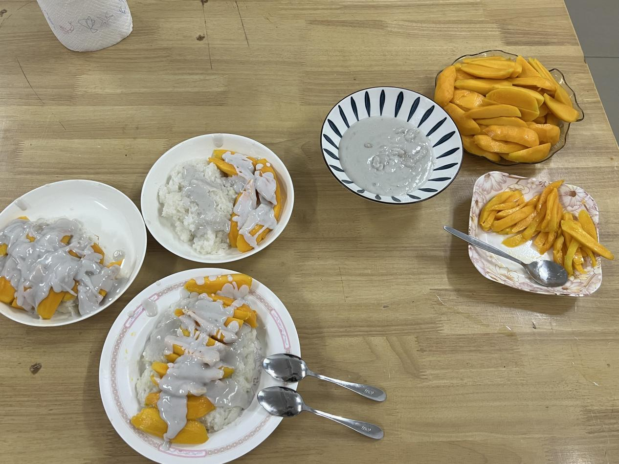 活动现场,气氛热烈。志愿者率先示范青团制作,从艾草汁提取、糯米粉搅拌,到包馅、蒸制,每一步都讲解得清晰透彻。参与者分组实操,志愿者穿梭指导,及时解决问题。随后,泰国留学生带来芒果糯米饭制作教学,一边展示流程,一边科普食材特性与烹饪技巧,让大家沉浸式领略泰国美食的独特魅力。