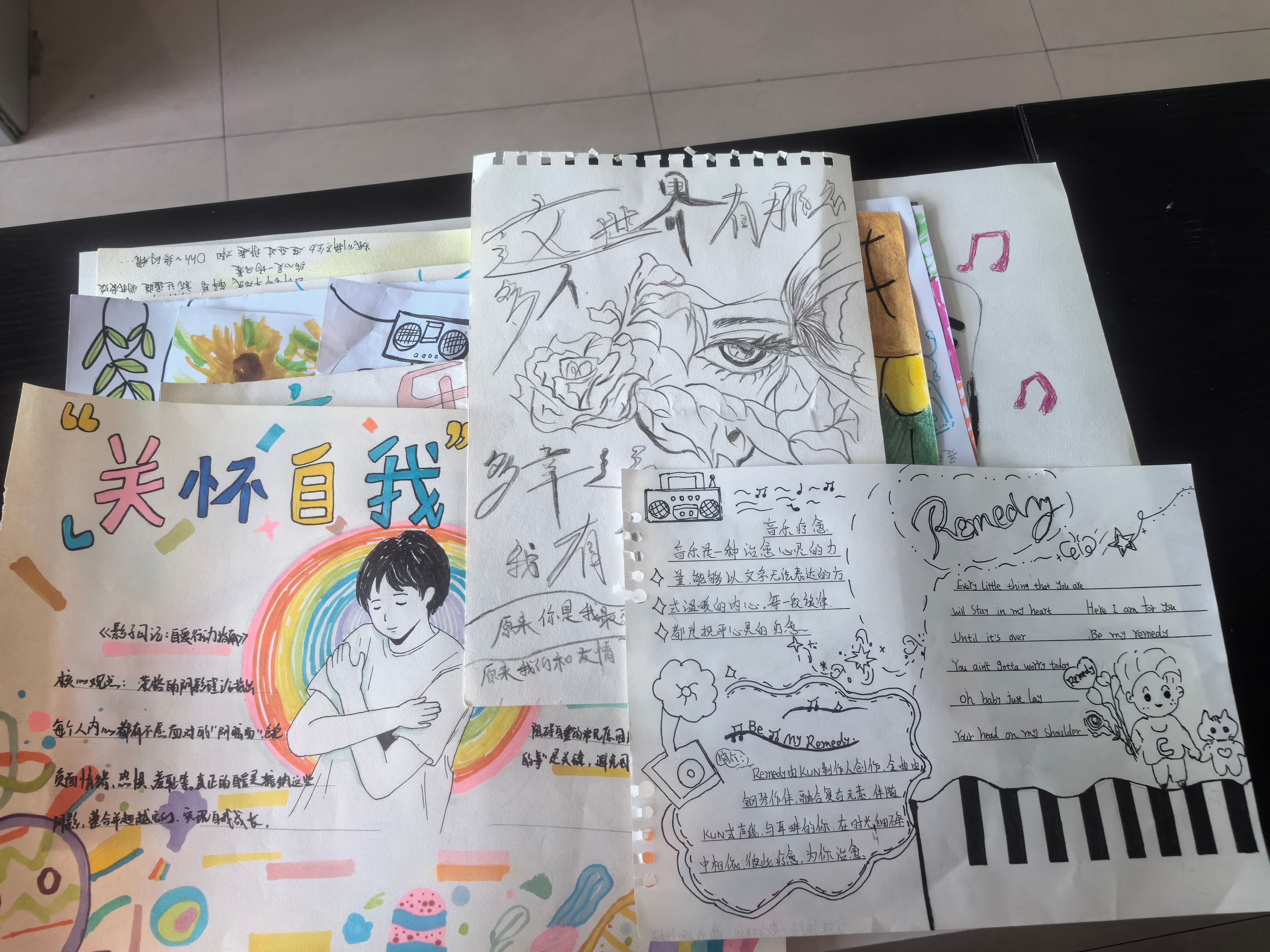 本次活动以“音乐绘画疗愈”为切入点,通过共创集体歌单、绘画接力等环节,帮助参与者以非语言方式表达情感。活动中,学生通过独立创作和组队协作两种方式,在A3画纸上描绘治愈歌曲的意境,将听觉感受转化为视觉艺术。色彩丰富的画面与工整的文字相辅相成,既展现了创造力,也为情绪释放提供了出口。