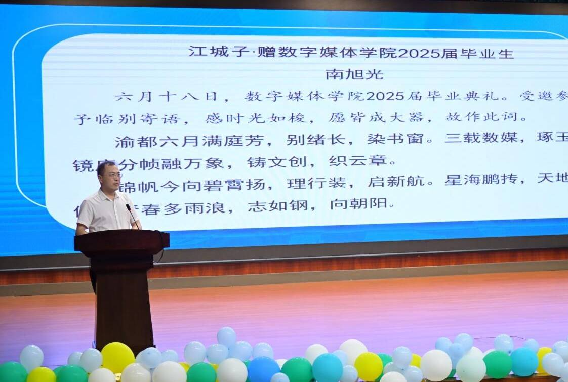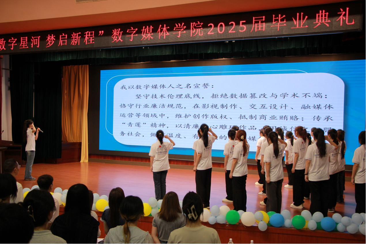 校领导寄语环节成为亮点。副校长南旭光以“江城子”词牌创作专属诗词,“锦帆今向碧霄扬,理行装,启新航”寄望学子以专业绘制时代画卷,“何惧青春多雨浪,志如钢,向朝阳”鼓励毕业生勇毅前行。紧随其后的廉洁视频《抉择》,引导毕业生坚守职业底线。宣誓仪式上,在数媒“青莲”党员先锋队全体同学的领誓下,毕业生们高举右拳,在“青衿守廉·数媒远航”的誓言中,完成了从校园到社会的精神加冕。