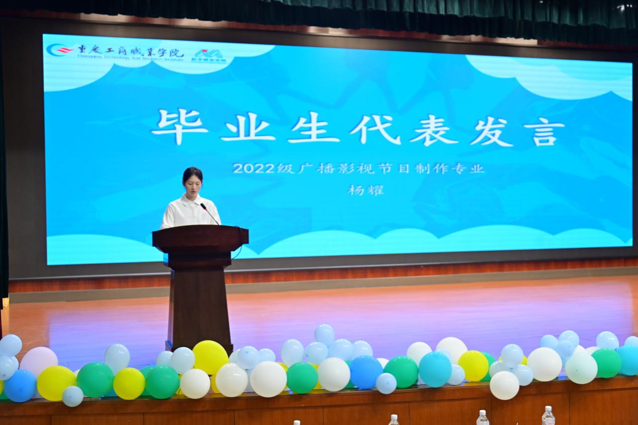 典礼在全场齐唱国歌中拉开序幕。毕业视频《拾光筑梦》回顾校园生活精彩瞬间,串联起三年校园记忆。2022级广播影视节目制作2班杨耀代表毕业生发言,致谢师恩并寄语同窗与学弟学妹。文体部成员用一曲《岁月神偷》点燃全场,将“偷走时光,却偷不走热爱”的毕业心声,化作流淌在会场的温柔诗篇。