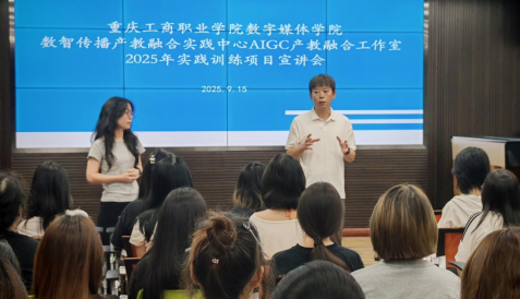 宣讲会伊始,学院办公室主任李可老师阐述了工作室成立的背景及其在产教融合战略下的重要意义。他强调,工作室将聚焦AIGC领域前沿技术与企业真实项目需求,为学生提供“学中做、做中学”的一体化实践环境,并鼓励同学们积极把握机遇,主动融入数字化产业生态。
