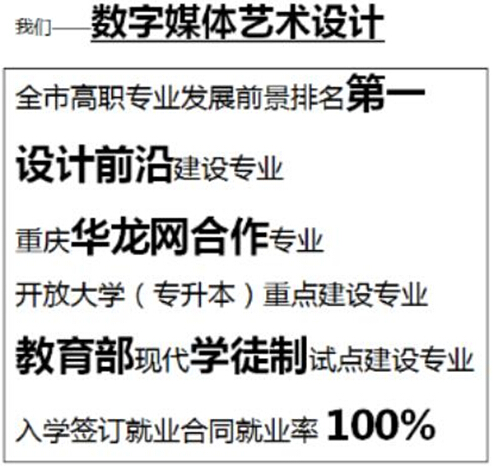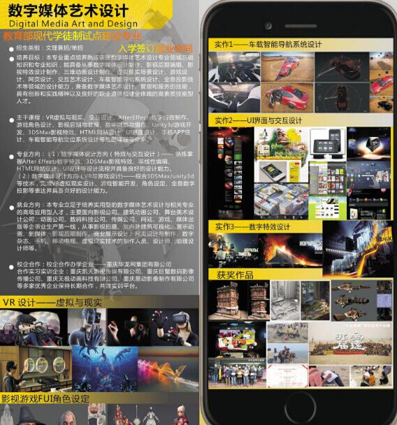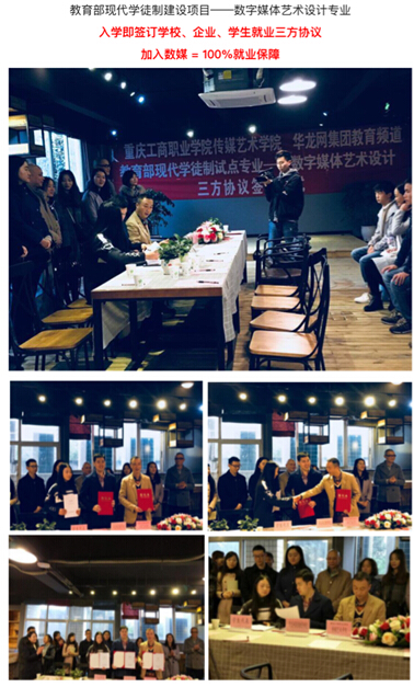 数字媒体艺术设计专业是国家教育部现代学徒制校企合作试点建设专业、全市高职专业发展前景排名第一 、优质国家高职建设专业、重庆门户华龙网合作专业、开放大学(专升本)重点建设专业 入校即签订就业合同,就业率100%。与重庆华龙网集团、北京中影华腾影视文化有限公司、重庆建筑设计研究院等知名企业合作,建立“校中企,企中校”基地,签订学生与企业、学校与企业共育人才合同,实现“入学即入职,就读即就业”的现代教育新模式,保证教学质量,保障就业渠道道。