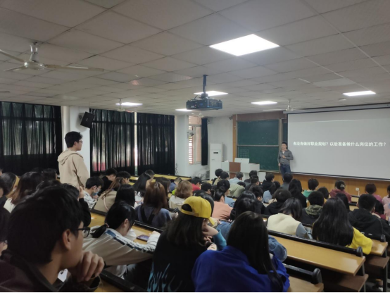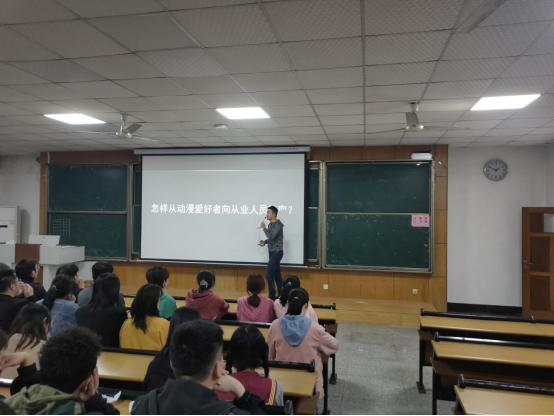 在讲座的开头部分,党鹏飞老师设置了一个问答环节,如:有没有做好职业规划?以后准备做什么岗位的工作?在增加与学生的互动性的同时也引出了此次讲座的主题——怎样从动漫爱好者向专业人元转变。为学生下半学期的毕业设计和今后的工作打下基础。