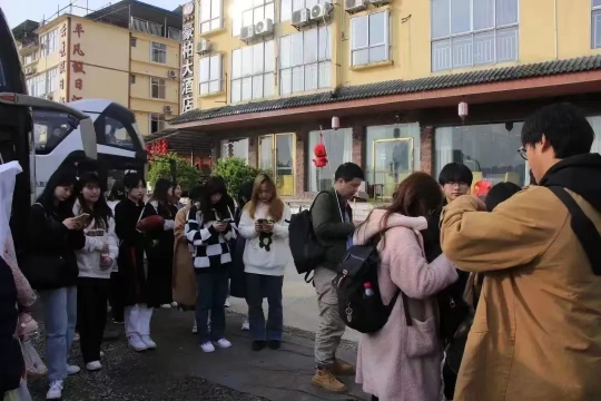 在游览完天生三桥后,同学们回到住宿酒店集合,踏上返程的道路