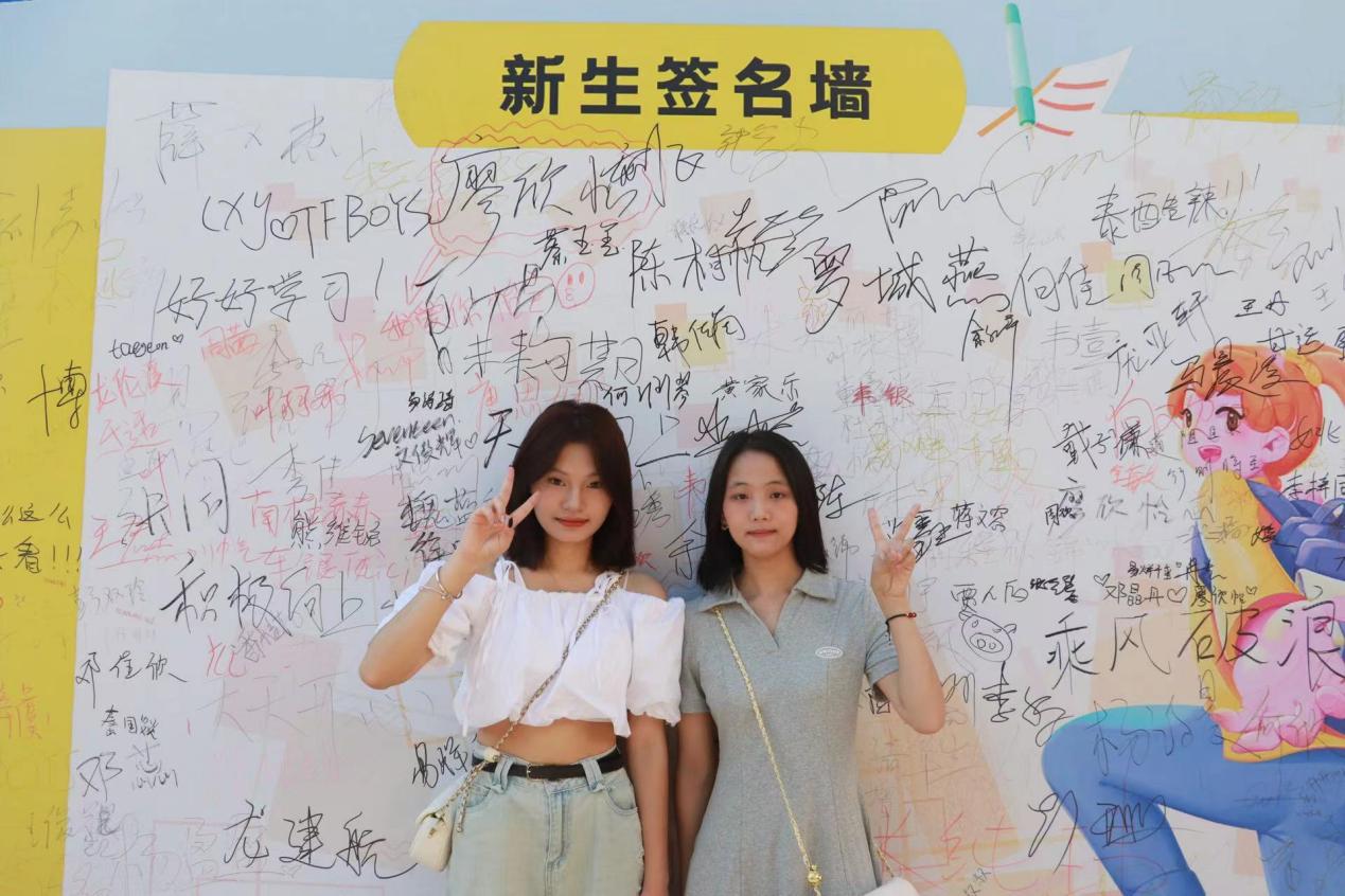 在报道流程完成后,图书馆门口耸立的一大块新生签名墙也是吸引众多同学留下自己的姓名以及对未来自己的期望憧憬,在签名墙前拍照打卡,从此开启自己大学新生活的信念起点。