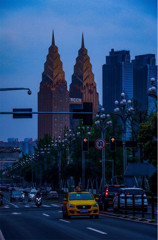 作品说明:赏霓虹之光,体雾都之美:作品主题:重庆标志性建筑,奢华至极的双子塔。在南滨路直拍傍晚的双子塔与周围建筑与马路形成冷暖对比,显得宁静却不失贵气;我们在双子塔左边的千佛寺与它身后的高楼照射出霓虹之光,显出神秘且美丽。却又显出一种独特的风光。