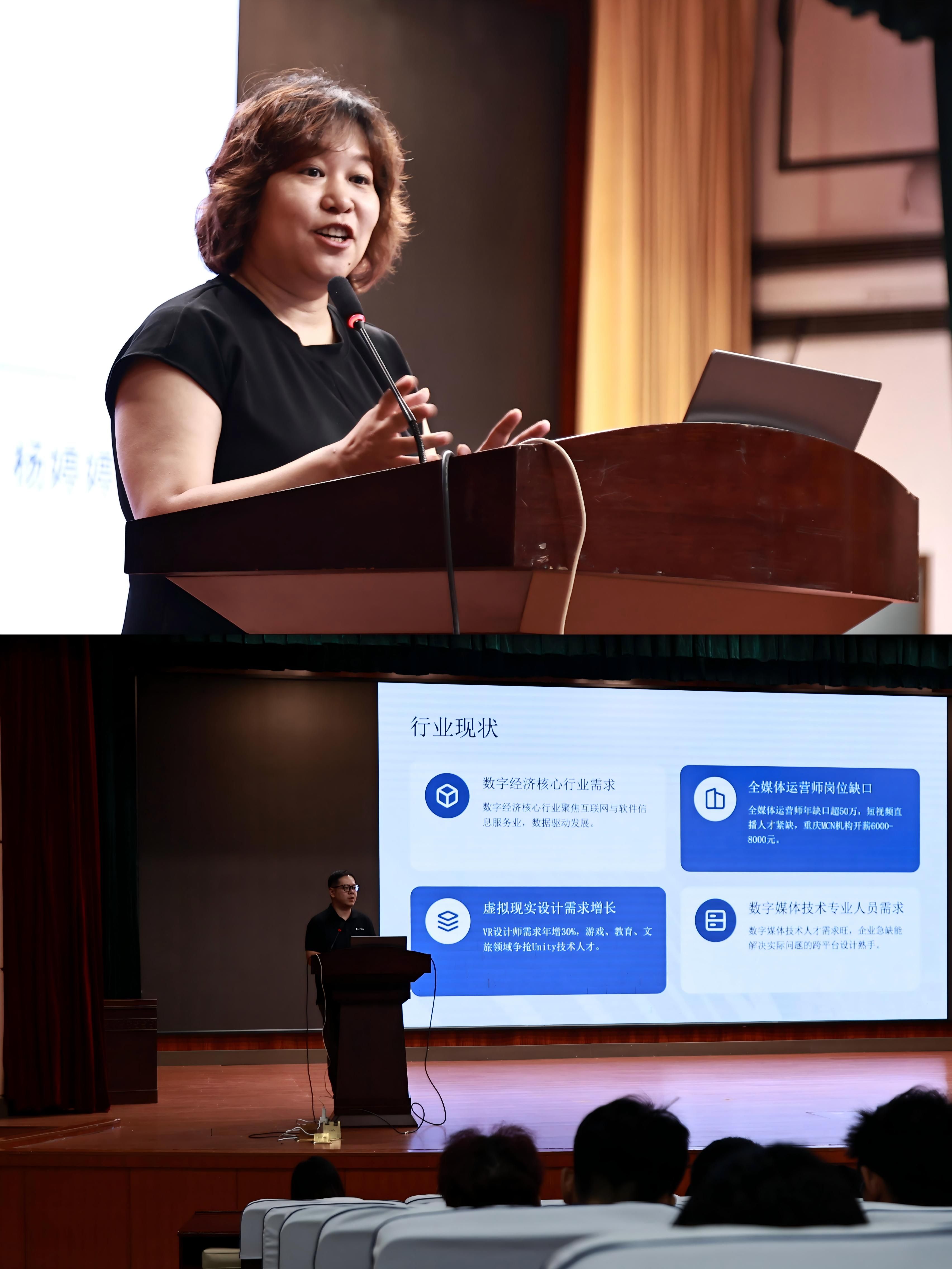 数字媒体学院副院长、专业带头人陈倬豪介绍了学院对两个专业的发展规划与师资建设情况,勉励同学们把握数字经济时代机遇,夯实专业基础、培养创新能力。教研室主任陈敏为新生绘制了专业学习与职业发展的“导航图”;两位专业负责人详细解读课程体系及核心软件工具;辅导员介绍了学业与升学相关政策;企业代表则从行业视角出发,分析了就业前景和岗位需求,增强了同学们对专业应用的直观认知。