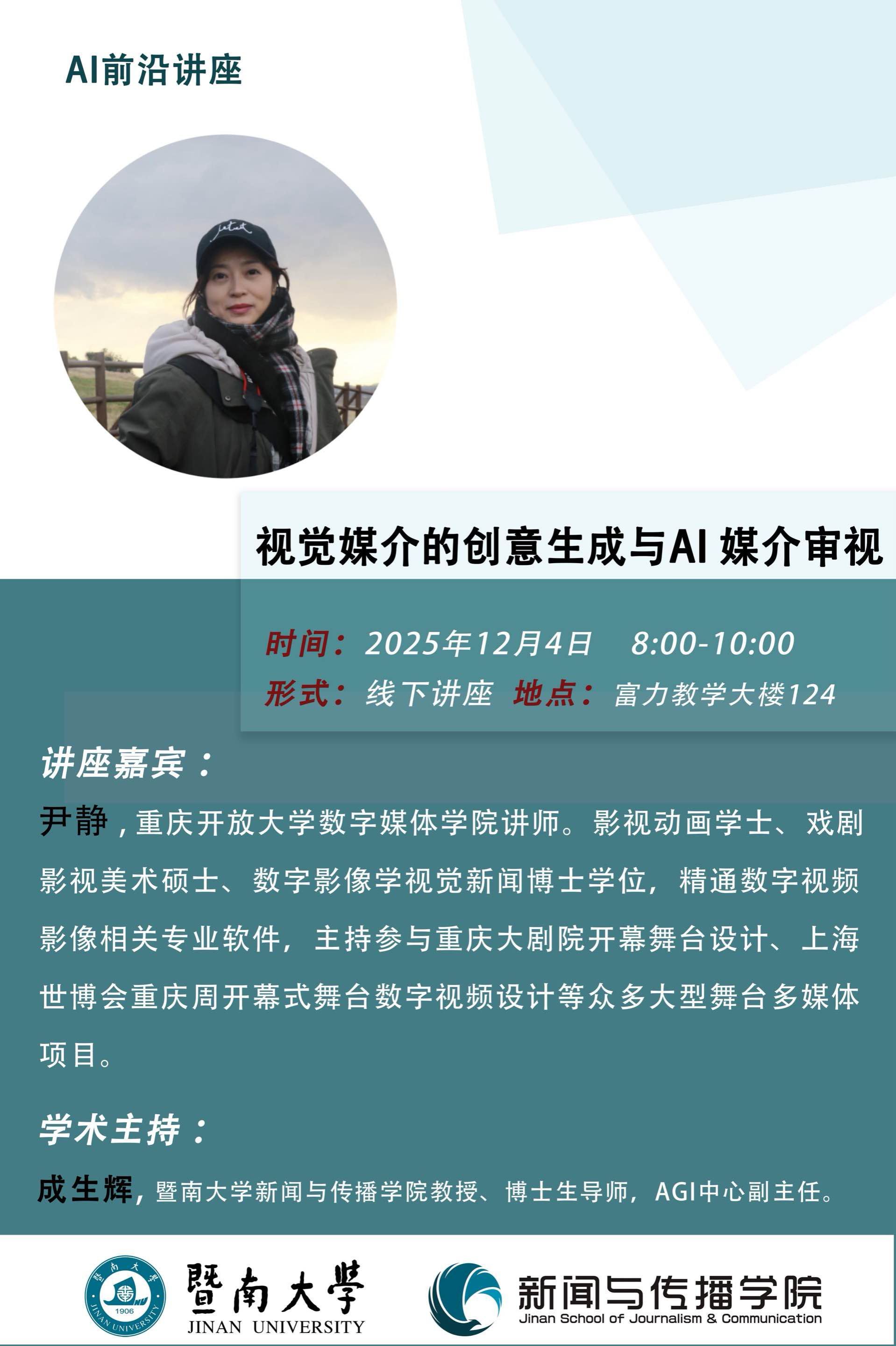 供稿:陈敏2025年12月4日上午8时至10时,数字媒体学院数智技术教研室尹静博士应邀在暨南大学新闻与传播学院作了题为“视觉媒介的创意生成与AI媒介审视”的专题讲座。讲座由暨南大学新闻与传播学院教授、博士生导师、AGI中心副主任成生辉担任学术主持
