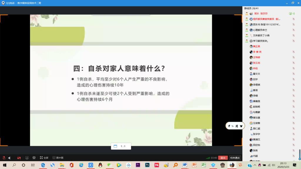 【供稿:袁鸿森】2020年3月23日晚上8点,学院2019级数字媒体应用技术专业成功开展“宅家抗疫与心理健康”主题班会,因疫情的原因,本次班会通过QQ群课堂,以网络平台进行分屏直播分享。本次班会由19级数字媒体应用技术专业学生干部进行主持,班主任老师刘猜、赵娜参会指导,19级数媒专业全体同学参加本次班会。