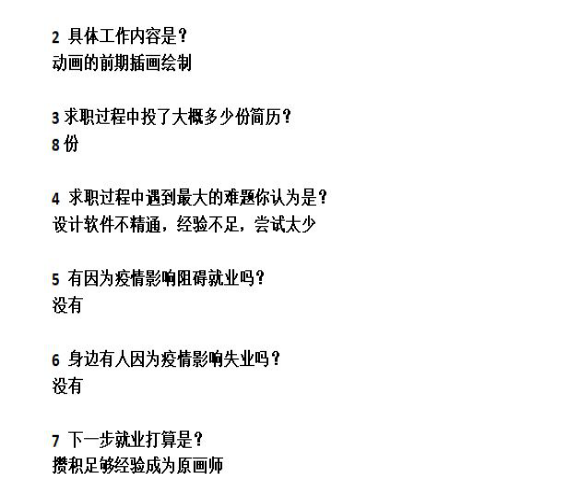 第一,问卷显示,疫情确实是同学们求职路上的一大阻碍,其中一位同学原本已就业,但因为疫情失业,不得不重新求职。 但疫情除外,自身职业素养,技能储备等欠缺更是同学们求职路上的拦路虎。第一批成功就业的同学中,有学生在校期间花大量时间在学校工作室学习的,有长期从事专业相关兼职工作的,也有其他工作经验较为丰富的同学。