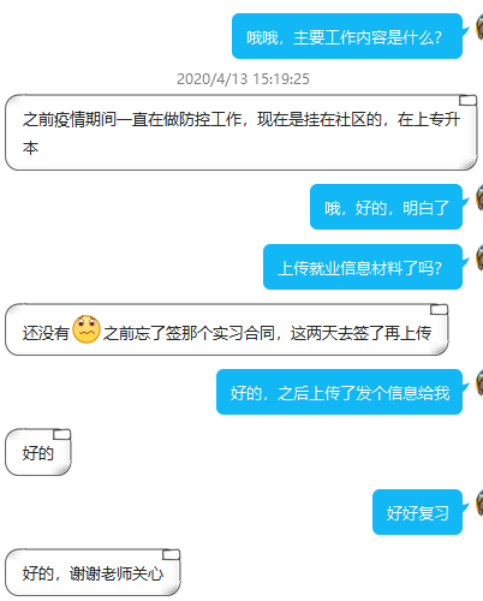 对于已经就业的同学,帮扶老师会跟进职场生活状况,解决同学们在职场上出现的小问题,帮助同学们拟定工作计划,让职场的生活有条有序,同时,老师们也会为同学们对职场的问题进行解答,让同学们更快的融入职场生活,还会给同学们在职场的人际关系给予小贴士,让已经就业的同学们在职场生活中成长更加的迅速。