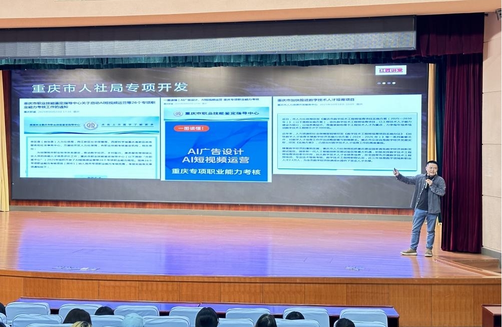 【供稿人:刘萃】为深化 “红匠精神” 培育,推动人工智能技术与数字媒体专业实践深度融合,数字媒体学院特邀四川美术学院艺术化科普研究院高级讲师董成,于10月20日下午4:30为全院学生带来主题为《AI 赋能实战营训练》的红匠课堂,近 600 名师生现场参与,沉浸式感受科技与艺术碰撞的魅力。