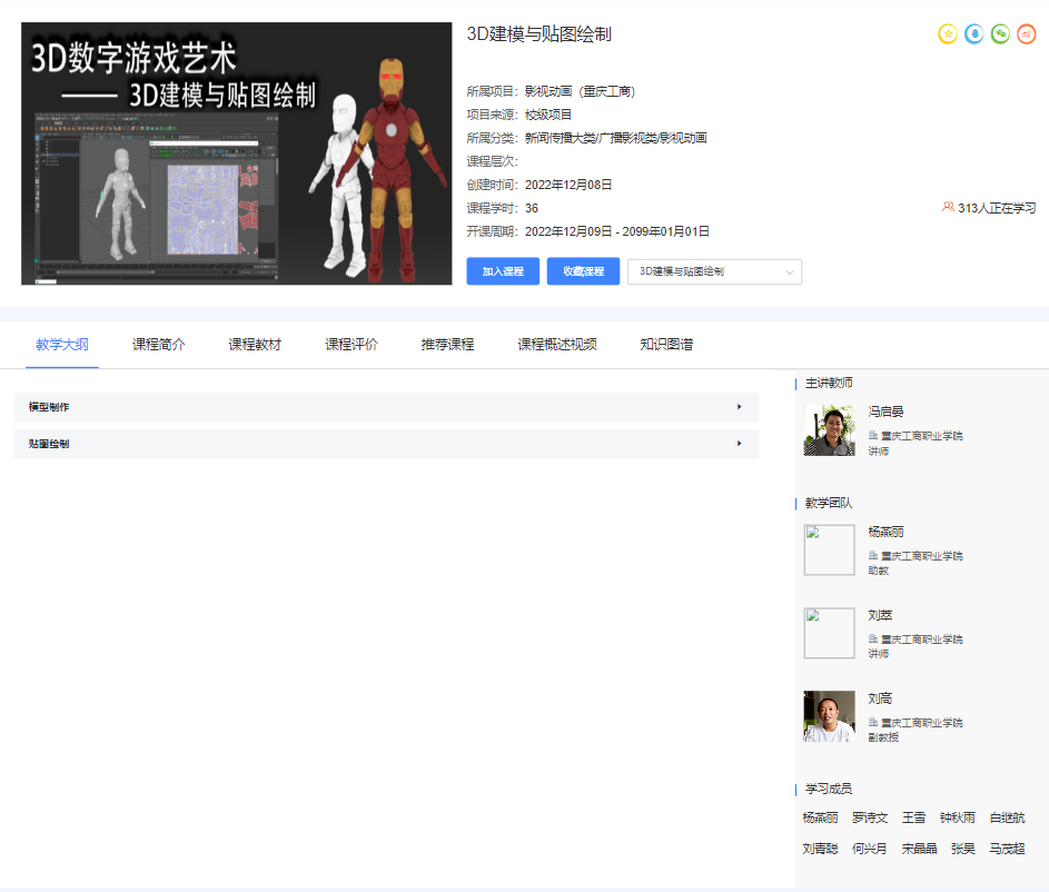 《3D建模与贴图绘制》精品资源共享课程的网络学习首页界面