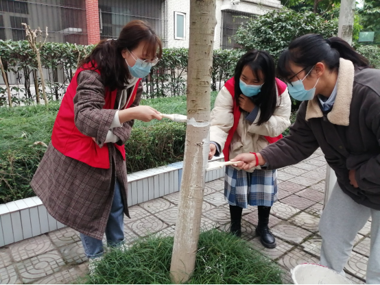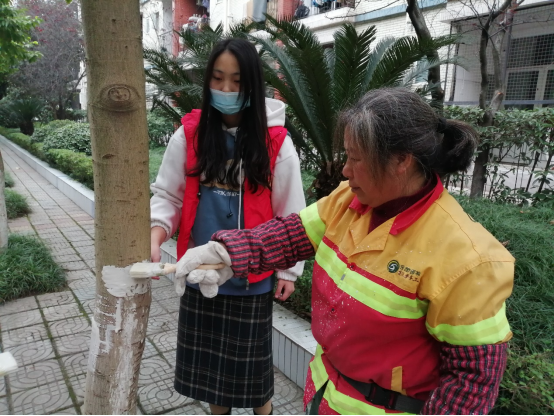 12月11日下午16:30,青年志愿者们穿着统一的制服聚集在食堂门口前,认真地听完园林伯伯讲解刷漆方法并领到工具后树木刷白的防虫主要功效,以及美化社区的重大意义,并示范了刷白工序,讲解了注意事项。随后大家带着桶、石灰、刷子等工具分别来到指定校园街道内开始为树木刷上白漆。许多同学虽然是第一次刷树,但都非常认真,高标准、严要求,即使石灰水溅到身上,也没有影响刷树的热情,大家都认认真真,一丝不苟。