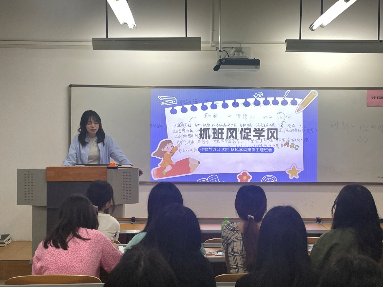 开展学风建设主题班会,激发学生学习内生动力。为激发学生的求知欲,实现学生从“要我学”到“我要学”的转变,传媒与设计学院开展学风建设主题班会,每位辅导员老师采用“小班召开,精准建设”的主题班会召开形式,在讲解学风建设的重要性和必要性的基础上,根据各班的学情提要求、制标准、找措施。依托班长、学习委员等学生骨干力量,进行班级学习质量的日常考核和考勤。最后,由学习委员带领全班同学宣读、签订学风建设承诺书。