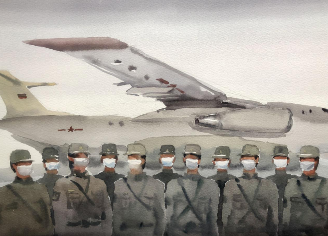 《奔赴抗疫战场》 水彩 陈一颖
