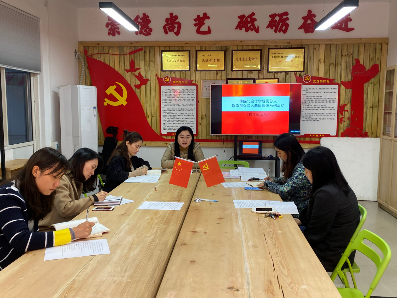 2019年11月1日下午4:30,传媒与设计学院党总支书记陈春燕同志和所有总支委员走进辅导员团队,围绕学工支部党建工作重点,开展了以“密切联系群众,深入基层调研”为主题的调研活动。会议由总支纪检委员苏丹同志主持,宣传委员葛璇同志做会议记录,学生科向晗璐等4名辅导员同志参加调研会议,大家畅所欲言,深入交流。
