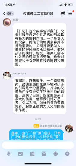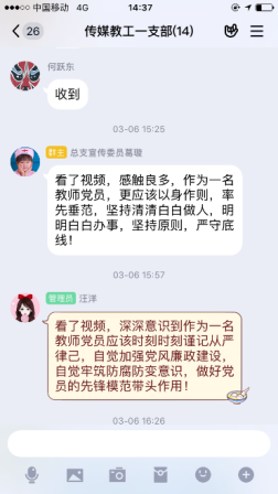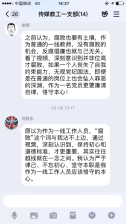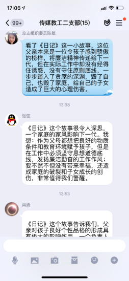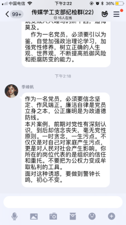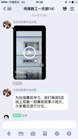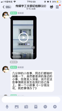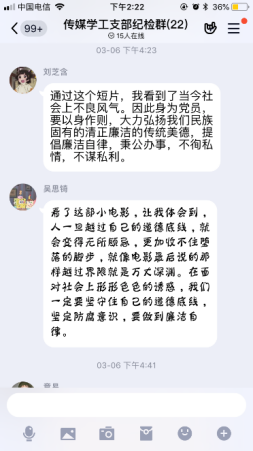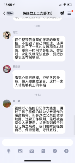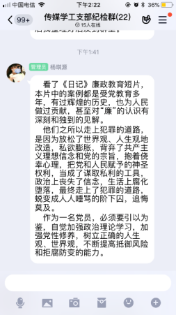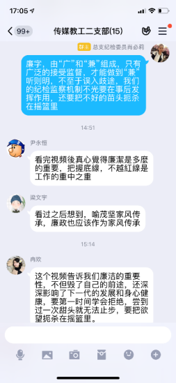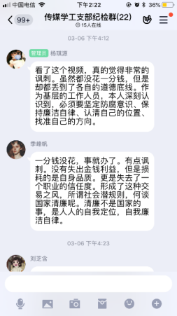 疫情当前,党风廉政建设宣传由线下转移到线上传媒与设计学院党总支在线上开展多种形式廉政宣传教育活动,加大力度,充分利用QQ、微信等“线上”新兴媒体与“线下”传统宣传模式相结合,强化廉政宣传教育,全体党员参与,积极主动的发表自己的感言。为学院的党风廉政建设和反腐败斗争提供了良好的精神动力、舆论支持和思想保证,努力营造了风清气正、崇廉拒腐浓厚氛围。