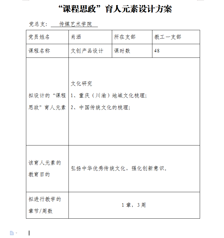 上一条:汪洋-《情景剧剧本写作》-“课程思政”育人元素设计方案 下一条:黄云璨-《游戏插漫设计》-“课程思政”育人元素设计方案