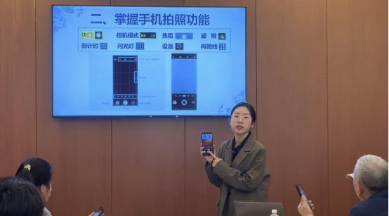 在活动现场,由学院安排的主讲老师在讲台上细心的为老人们讲解关于相机的每一个功能,并且留给老人们足够的时间去消化理解。