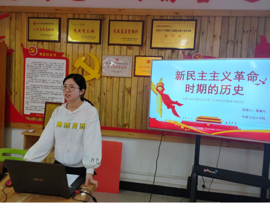 本次学习由传媒与设计学院党总支学工支部教师党员童曦月领学,支部预备党员、35期积极分子共同参与了此次读书学习。在此次活动中,童曦月老师带领大家重新整理回望了新民主主义革命那段峥嵘岁月。童老师从为什么要学习党史、党的创建历程、抗日战争、第三次国内革命战争时期的发展历程等方面,全面梳理了中国共产党在新民主主义革命时期的光辉历史。她讲到,此次带领大家学习新民主义革命历史,是希望大家能够真正弄清楚我们从哪里来、往哪里去。大家作为新时代青年,生逢盛世、肩负重任,相信同学们能够以革命前辈为榜样,为社会主义现代化建设和共产主义发展做出自己的贡献。