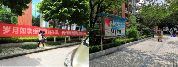 校园中,鲜红的横幅和五彩的海报,传达着浓浓的毕业情怀。走在校园的路上,微风拂面,栀子花香,飘扬着不散的深切祝福。