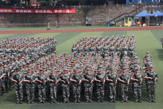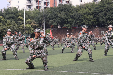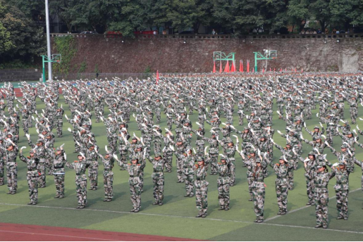 整齐的刺杀操方队由整化散,他们随着口令过着一招一式,口号声随着变换的招式气势磅礴,直冲云霄,千百人的阵容声势浩荡。
