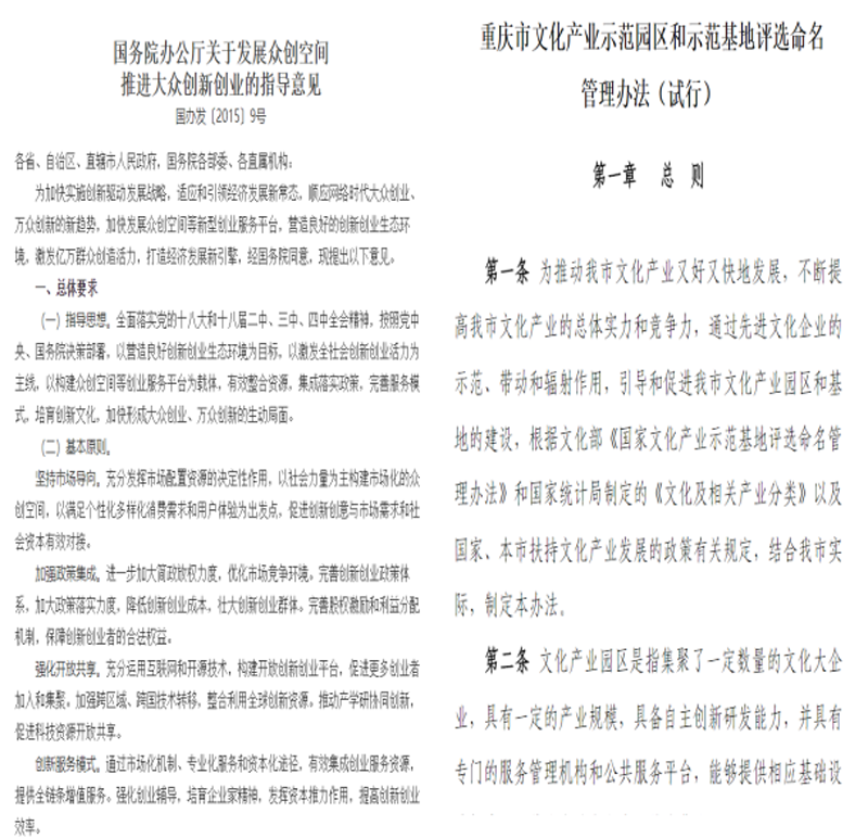 基地被授予“重庆市文化产业示范基地”以来,一直以《重庆市文化产业示范园区和示范基地评选命名管理办法》、《国家文化产业示范基地管理办法》《国务院办公厅关于发展众创空间推进大众创新创业的指导意见》等政府文件精神为指引,充分利用高校的有利条件,着力发挥政策集成效应,集聚创新人才、创业微企。提供低成本、一站式的众创服务,助推创业微企“设计作品→知识产权→创意经济”的转化整合校内实训资源,盘活科研技术装备资源存量,挖掘空间潜能,依据产业链,构建了“教师研究工作室(上游创意研发)、学生创业工作坊(中游技术实现)、专项实训室(下游项目生产)”三大创新创业环境。构建连接式、互动式双赢机制,2016年1月实现了众创空间融入产业基地,建成了集实习实训、创业孵化、技术研发、社会培训于一体的四维共享性创意产业基地。