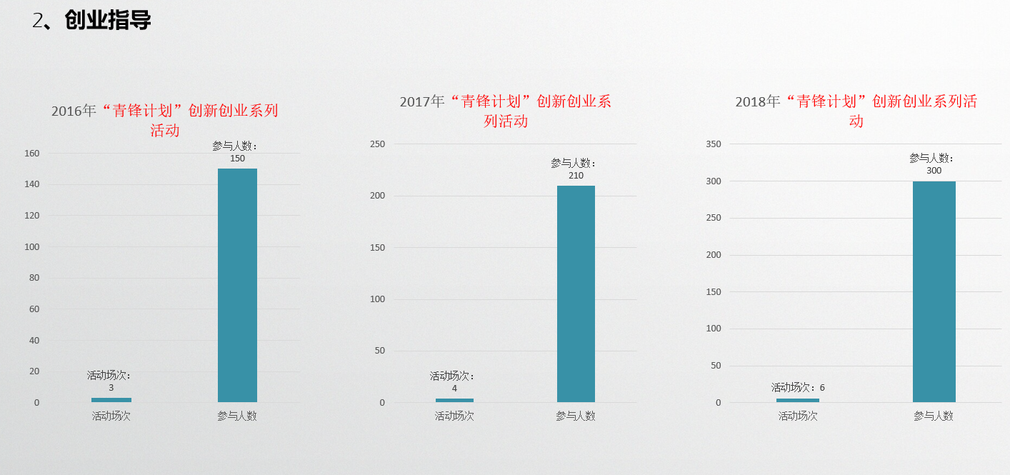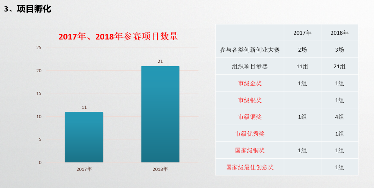 2016年组织创业项目申报8项,2017年组织创业项目申报11项,2018年组织创业项目申报21项,共组织创业项目申报40个项目;2017年参与省市级、国家级创新创业大赛2场,组织项目参赛11组,其中获市级金奖1组,市级铜奖1组,获国家级铜奖1组;2018年参与省市级、国家级大赛3场,其中组织参赛项目21组,其中获得市级金奖1组,市级银奖1组,市级铜奖4组,优秀奖1组,获得国家级铜奖1组,最佳创意奖1组。