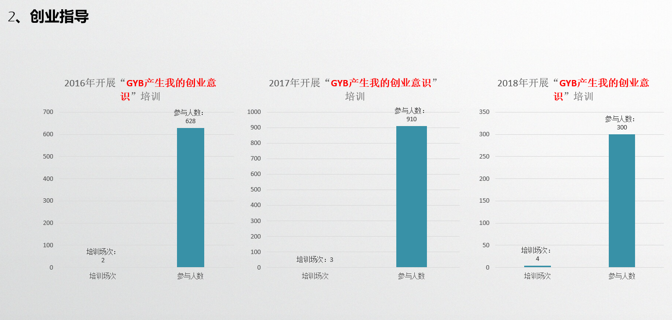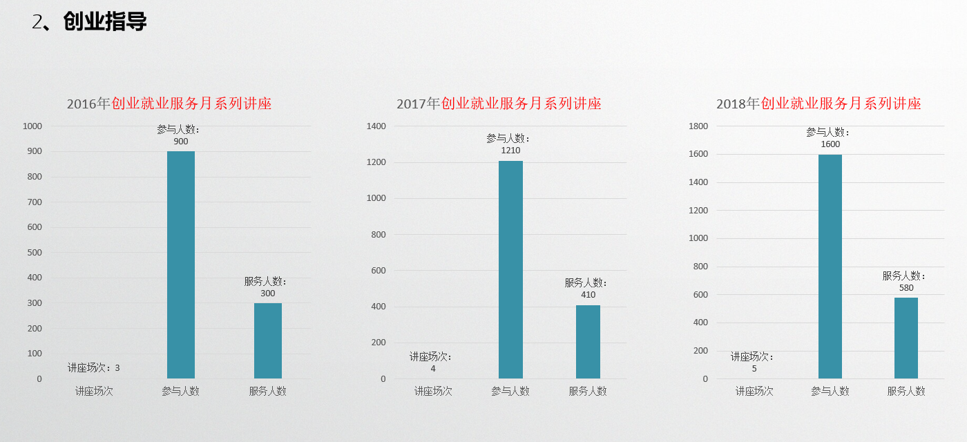 创意九龙众创空间开展一系列创新创业教育培训、讲座、活动。 2016年开展“GYB产生我的创业意识”培训2场,培训628人次,开展创业就业服务月系列讲座3场,参与900人次,服务应届毕业生320人,参与组织“青锋计划”创新创业系列活动3场,共服务150人次;2017年开展“GYB产生我的创业意识”培训3场,培训910人次,开展创业就业服务月系列讲座4场,参与1210人次,服务应届毕业生410人,参与组织“青锋计划”创新创业系列活动4场,共服务210人次;2018年开展“GYB产生我的创业意识”培训4场,培训1280人次,开展创业就业服务月系列讲座5场,参与1600人次,服务应届毕业生580人,参与组织“青锋计划”创新创业系列活动6场,共服务300人次;共开设创新创业课程《大学生创业基础》、《创新思维训练》等共12门,达300个学时,累计共850人参与学习。